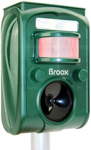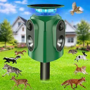 • Features: Effectively Repels Unwanted Animals & Pests - Motion Detection: Triggers an Ultrasonic Sound & Light Flash Built-in Speaker Emits a Safe Ultra-High Frequency Alert - Rugged Marine Grade Waterproof Construction Works Day or Night: Built-in IR Infrared Detection Sensor - Battery Powered (4 x 'AA'), Rechargeable Batteries Included Automatic Charging via Built-in Solar Panel - (2) Mounting Options: Wall Mount or Outdoor In-Ground Mounting Works for Unwanted Bats, Birds, Pigeons, Pests, Critters - Perfect for Gardens, Front Yards, Back Yards, Flowering Areas