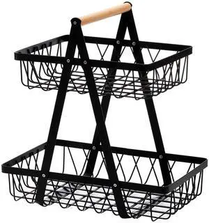 Metal Storage Basket with Handles, 2 Tier Wire Snack Organizer Bin for Office Cournertop, Rustic Black Basket for Home, Kitchen, Pantry, Fruit, Coffee, Pasta, Bathroom, Living Room