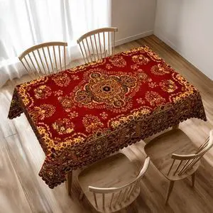 Red Gold Boho Rectangle Table Cloth for Dining Tables, Reusable Red Persian Tablecloths Bohemian Vintage Retro Tabletop Decor Tribal Table Cover for Kitchen,Picnic,Party,54x72Inch