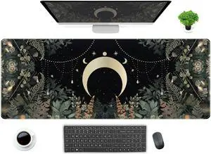 Cute Green Forest Leaves Desk Mat Whimsical Moon Mousepad XL Large Extended Gaming Mouse Pad with Stitched Edges, Computer Laptop Keyboard Mouse Mat Desk Pad 31.5x11.8 in Non-Slip Rubber Base