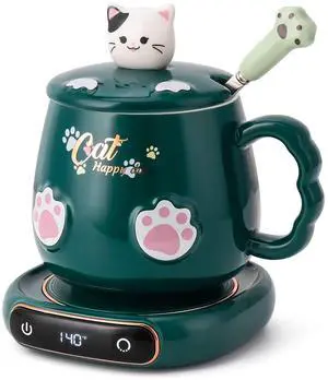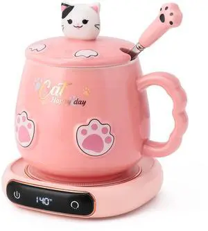 Coffee Mug Warmer & Cute Cat Mug Set, Beverage Cup Warmer for Desk Home Office with Three Temperature Up to 140/ 60, Coffee Warmer for Cocoa Milk Tea Water Candle, 8 Hours Auto Shut Off