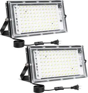 100W LED Outdoor Flood Light, 2 Pack 8000LM Plug in Flood Light Outdoor, IP66 Waterproof Exterior Security Lights, 6500K Daylight White Super Bright Floodlight for Garage, Yard, Lawn, Garden
