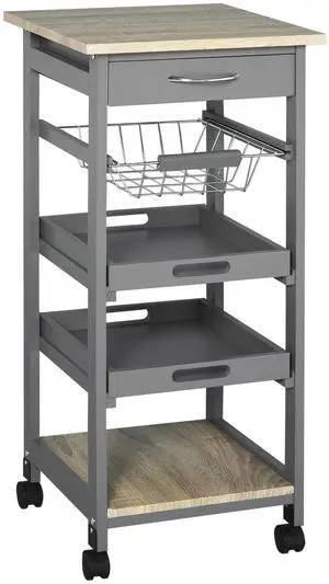 Mobile Rolling Kitchen Island Trolley Serving Cart with Underneath Drawer & Slide-Out Wire Storage Basket, Grey
