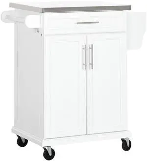 Kitchen Island on Wheels, Rolling Kitchen Cart with Stainless Steel Countertop, Drawer, Towel Rack and Spice Rack, Utility Storage Trolley, White