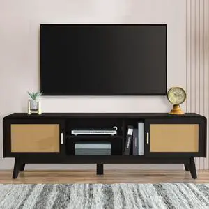 63'' Dark Rattan TV Stand with 2 Storage Cabinets for 65 Inch TV, Entertainment Center with Solid Wood Legs, Media Console Table for Living Room, Bedroom