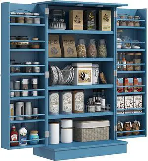 41" Kitchen Pantry Storage Cabinet, Freestanding Kitchen Cabinet with 12 Door Shelves, Double Doors, 5-tier Shelving and Adjustable Shelves, Blue