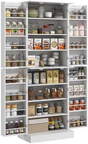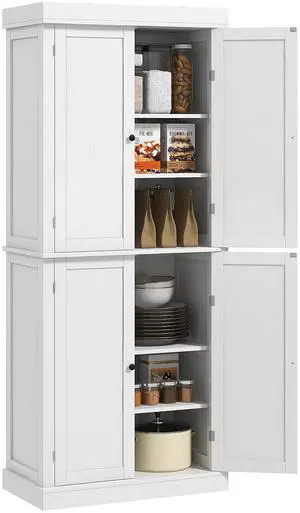 72.5" Freestanding Kitchen Pantry Cabinet, Tall Storage Cabinet with 4 Doors and 2 Adjustable Shelves for Dining Room, White Wood Grain