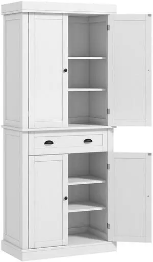 72.5" Kitchen Pantry Cabinet, Traditional Freestanding Storage Cabinet with 4 Doors, Drawer and 3 Adjustable Shelves for Dining Room, White Wood Grain