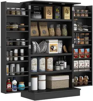 41" Kitchen Pantry Storage Cabinet, Freestanding Kitchen Cabinet with 12 Door Shelves, Double Doors, 5-tier Shelving and Adjustable Shelves, Black