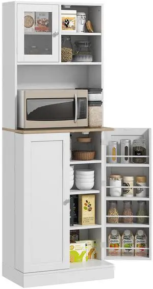 66.5" Pantry Cabinet with Microwave Stand, Freestanding Kitchen Storage Cabinet with Hutch, 8 Door Shelves, Adjustable Shelves, Food Pantry Cabinet for Dining Room, White