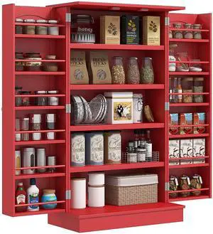 41" Kitchen Pantry Storage Cabinet, Freestanding Kitchen Cabinet with 12 Door Shelves, Double Doors, 5-tier Shelving and Adjustable Shelves, Red