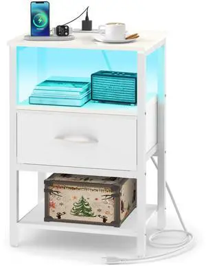 LED Night Stand with Charging Station, White Nightstand with Fabric Drawers, Bedside Table with Storage Shelf, End Table for Living Room/Bedroom/Dorm
