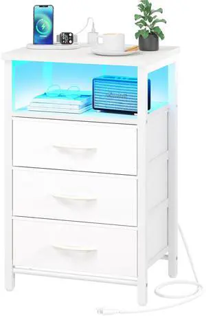 Night Stand with Charging Station, 16 Colors LED Nightstand with USB Ports and Outlets, End Table with 3 Fabric Drawers and Storage Shelf, Bedside Tables Small Dresser for Small Space White