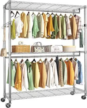 Himimi 3 Tier Heavy Duty Garment Rack, Portable Wire Shelving Clothes Rack for Hanging Clothing with Double Rods, Wheels and Side Hooks, Freestanding Metal Wardrobe Storage Rack,Grey