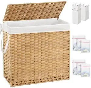 SETVSON Laundry Hamper with Lid Laundry Basket 132 L (35 Gal) Wicker Clothes Hamper, Handwoven Rattan Hamper with Handles and 4 Removable Liner Bags, 6 Mesh Bags for Laundry Bedroom Natural