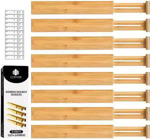 Expandable Bamboo Drawer Dividers 8 pack with labels(17"-22") Drawer Organizer for Kitchen, Clothes,Utensils,Silverware,Dresser,Office,Desk