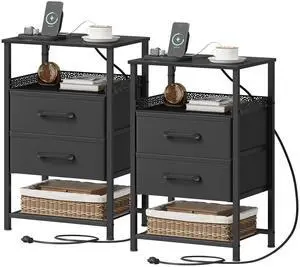 Nightstand Set of 2, Night Stands with Charging Station, 26.4 Inch Tall Bedside Table with Metal Shelf, Side Table with 2 Fabirc Drawers for Bedroom, Black