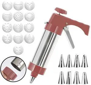 Stainless Steel Cookies Press, Cookies Press Gun Kit with 8 Piping Tips & 13 Cookie Discs, Biscuit Maker Machine, DIY Cake Decorating Kitchen Baking Supplies for Party Birthday Holiday