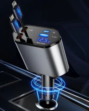 Retractable Car Charger, 4 in 1 Fast Charging Car Charger USB-C & USB-A Compatible with iPhone 16/15/14/13/12/11/X,Galaxy,Pixel