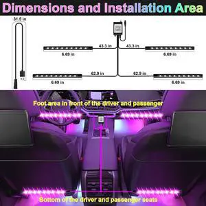 Aura Pro Double Row Car LED Lights Interior with APP Control, Multicolor Mode, Sound Active Function Inside Ambient Lighting Kit, Footwell Floor Decor, Car Charger Adapter 12V, 4pc