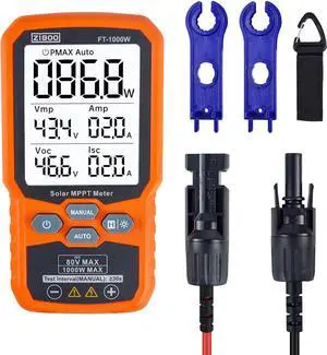 ZIBOO FT-1000W Solar Panel Tester MPPT Meter - 1000W Max Power, 80V/35A PV Module Tester for Voc/Isc, Open Circuit Voltage & Short Circuit Current, with Backlight & Data Hold