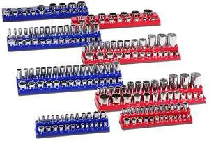 Magnetic Socket Organizer Set, 8PCS Socket Holder, 1/4'', 3/8'' & 1/2'' Metric SAE Socket Trays with Clear Labels, Hold up to 199PCS Standard & Deep Sockets, Blaue & Red (Sockets Not Included)