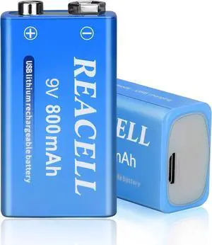 2 Packs Rechargeable 9V Lithium Batteries, 9 Volt Batteries for Smoke Detector, 800mAh 9V USB Charging for Microphones, Walkie-Talkie and Toys