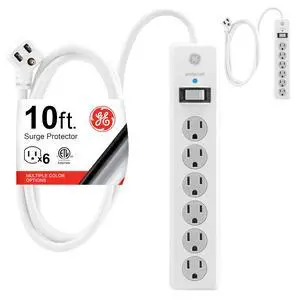 E Surge Protector Power Strip, 10 Ft Extension Cord, 6 Outlet Extender, 800 Joules, Flat Plug, Twist-to-Close Safety Covers, ETL Listed, White, 2 Pack, 46862