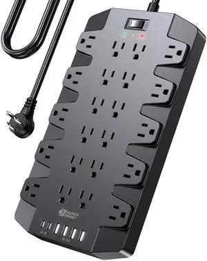 6 Ft Extension Cord Power Strip, Surge Protector with 12 AC Outlets and 4 USB Ports for Home, Office, Dorm Essentials, 1875W/15A, 2700 Joules, ETL Listed, Black