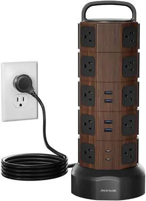 Power Strip Tower Surge Protector 1050J, 20 AC Outlets 6 USB Ports, 13A Desktop Electrical Charging Station, 6.5ft Heavy Duty Extension Cord, for Home, Office, Garage, Black Walnut