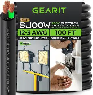 GearIT 12/3 12 AWG Portable Power Cable (100 Feet - 3 Conductor) SJOOW 300V 12 Gauge Electric Wire for Motor Leads, Portable Lights, Battery Charger, Stage Lights and Machinery -100ft Electrical Cord