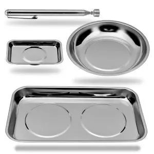 4PC Magnetic Tray Set with Magnet Stick Extra Strong Magnets, Stainless Steel Trays, and Telescoping Pickup Tool for Organizing and Retrieving Metal Parts