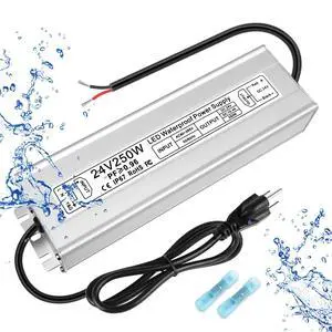 LED Driver 250W 24V Power Supply, IP67 Waterproof Low Voltage Transformer, AC 80-265V to DC 24V 10.4A Converter with 3-Prong Plug 3.3 Feet Cable for Outdoor LED Lights, Industrial, Computer