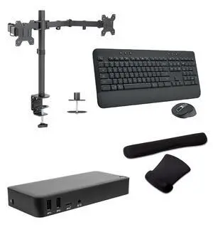 Targus Universal USB-C Dual 2K, Triple FHD 85W Dock Bundled with Desk Mount Dual Monitor Stand, MK650 Wireless Keyboard & Mouse combo and Gel Mouse & Wrist Pad