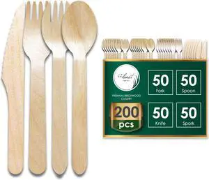 Planet Pantry Disposable Birchwood Cutlery Wooden Bamboo-Like for Party - Fork Spoon Knife & Spork - 50 pcs each