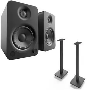 Kanto YU6MB YU6 Matte Black 200 Watt Peak Powered Speakers, Pair, with Pair of SP32PL 32" Floor Speaker Stands, Black