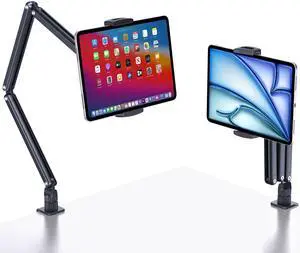 Lucrave Tablet Desk Stand Holder, Extendable Arm Table Mount for iPad, Aluminum 360° Rotating Bracket with Metal Base, Compatible with 4.7-13 Inch Tablets, Phones, Samsung Galaxy, Kindle Fire HD