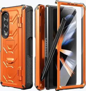 For Samsung Galaxy Z Fold 4 Case with S Pen Holder Built-in Kickstand & Screen Protector, 360° Full-Body & Hinge Protection Rugged Heavy Duty Phone Cover for Galaxy Z Fold 4 2022 5G Orange