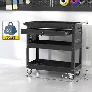 3 Tier Rolling Tool Cart on Wheels, Industrial Heavy Duty Tool Cart with Drawers, 500 LBS Utility Carts with Hooks and Locking System for Garage, Warehouse, Workshop (Black)
