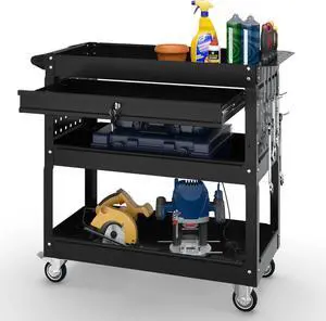 3 Tier Rolling Cart, Heavy Duty Utility Industrial Service Carts on Wheels, Metal Tool Cart with Locked Drawers, Ideal for Garage, Warehouse and Repair ShopBlack