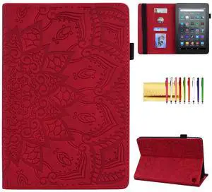 Case for Amazon Fire 7" 2022 12th Generation, Techcircle Mandala Embossed PU Leather Folio Stand Soft TPU Back Cover Slim Lightweight Elastic Band Protective Case with Card Slots & Pen Holder, Red