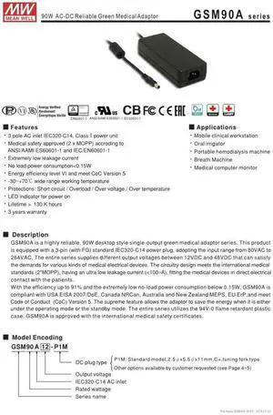 MEAN WELL GSM90A48-P1M 48V 1.87A 90W AC-DC Reliable Green Medical Adaptor