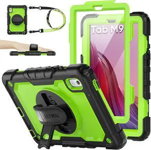 Case for Len-ovo Tab M9 (TB-310FU) 2023 with Screen Protector, Drop-Proof Protection Cover with 360° Rotating Stand &Strap [Pen Holder] Case for Len-ovo Tab M9 9'' (Green+Black)