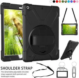 New iPad 9.7 2018 2017 Case 5th 6th Generation Three Layer Heavy Duty Soft Silicone Hard Bumper Case with Kickstand and Shoulder strap Shockproof Durable Rugged Case for New iPad 9.7 Inch 2018 2017