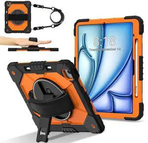 Case for iPad Air 13 Inch M4/M3/M2 2026/2025/2024 with Rotating Stand Pencil Holder Hand/Shoulder Strap, Heavy Duty Shockproof Protective Cover Orange