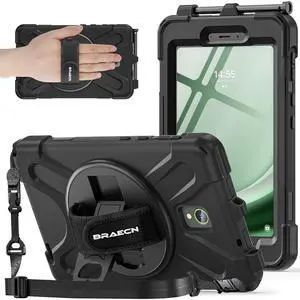BRAECNstock for Samsung Galaxy Tab Active 5/ Active 3 Case 8 inch with Screen Protector Shockproof Protective Galaxy Tab Active 5/3 Tablet Cover for Kids Rotating Hand Strap + Stand Pen Holder - Black