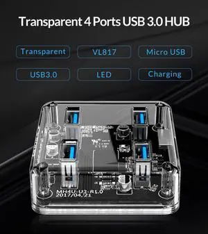 ORICO Creative Transparent HUB 4 Ports USB3.0 Super Speed with Reserced Micro USB3.0 External 5V Power Supply Support OTG Function 100cm USB Cable Optimised for PC Windows Linux Mac OS
