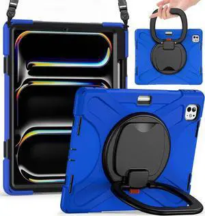 JAENFONG for iPad Pro 13 inch Case (2024) M4 Chip Model A2925/A2926 Heavy Duty Rugged Durability Silicone Tablet Cover with 360° Rotating Ring Foldable Kickstand & Shoulder Strap, Blue