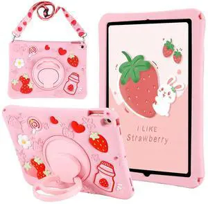 for iPad 9th/8th/7th Generation 10.2 Inch Case (2021/2020/2019) - Soft Silicone Cute Cartoon with Shoulder Strap & Rotating Stand Kawaii for Women Girls Girly Teens Cover, Strawberry