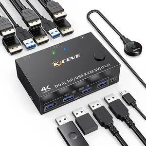 DP Dual Monitor KVM Switch DisplayPort 1.4 USB 3.0 Switcher Controls Splitter For Computer Laptop Sharing Keyboard Mouse Printer